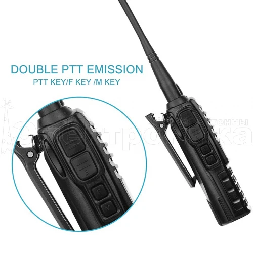 ТЕХНИЧЕСКИЕ ХАРАКТЕРИСТИКИ: Диапазон частот: 400-470 / 136-174 Мгц Мощность: до 5Вт Емкость аккумулятора: 2800 мАч - BL-8 Пылевлагозащита: IP54 Число каналов: 128 Шаг сетки частот: 5 кГц Напряжение питания: 7.4 В Чуствительность: 0.16 мкВ Дальность вещания: 7 км Цвет: черный Вес: 238г Размер: 132*60*35 мм Материал: пластик